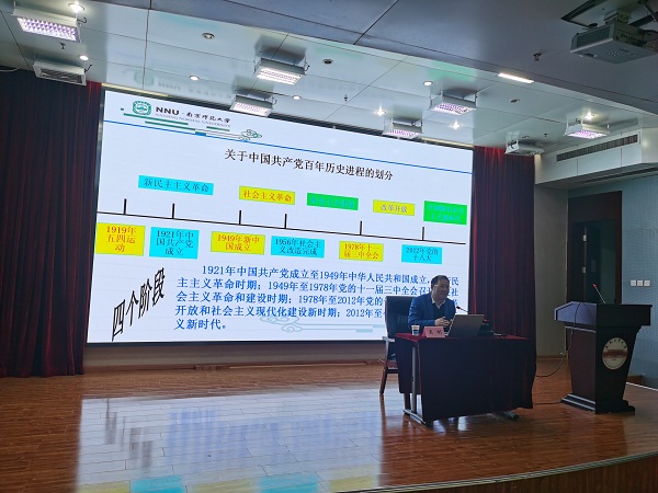 王刚教授以“学习党史-探秘中国共产党为什么‘能’”为题,着重通过中共党史若干重大问题阐释了中国共产党为什么“能”的历史密码,并详细讲述了与之相关的“历史和人民为什么和怎样选择了马克思主义”“为什么要成立中国共产党”“关于中国革命新道路问题”“关于社会主义改造问题”“关于抗美援朝问题”“为什么要从‘改革’推进到‘全面深化改革’”“十九届五中全会的文件精神”等九个重大理论问题,并结合现实做了“中国共产党‘能’在哪里”的学理性思考与概括。全场报告将唯物辩证法与历史理论深度结合,将社会现实与历史事实高度结合,历史性、学理性与现实性充分体现,现场气氛活跃,师生反响热烈。