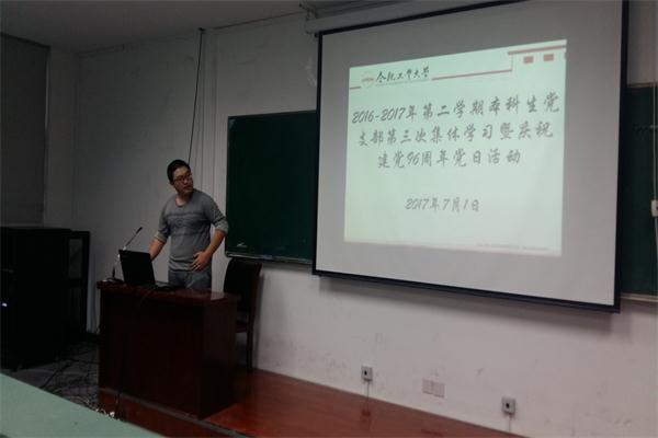 | 7月1日晚,金沙威尼斯官网本科生一二三年级党支部第三次集体学习暨庆祝建党96周年党日活动在建筑艺术馆举行。党支部书记和本学期新发展党员参加了此次活动。 首先,本学期新发展党员在支部书记王吉萌的带领下庄严宣誓,重温了入党誓词;王吉萌通过对各种图片和影像资料的解读对入党誓词以及入党仪式的发展历程进行了深入浅出的讲解,加深了新发展党员的组织意识。 随后,全体党员在王吉萌的带领下对新华社社论《永葆共产党人的奋斗精神》开展了认真的学习。在理论学习结束后,全体党员还集中观看了反腐教育片《永远在路上》,再次坚定了“打铁还需自身硬”的理想信念。在集体学习之后,全体党员围绕“永葆共产党人的奋斗精神”进行了讨论发言。朱悦从习近平总书记在香港的讲话谈起,阐述了中国共产党人“一国两制”伟大构想的创造性精神;徐东辉从参加井冈山培训的见闻感受谈起,表达了对革命传统精神的传承之志;崔兴红则分享了一名新党员对党组织的认识与加入组织的自豪心情。 本科生新进党员认真参加了第一次组织生活,以昂扬饱满的态度庆祝中国共产党的96岁生日。相信,通过此次活动能够使本学期新发展的党员们进一步坚定理想信念,规范组织生活,成长为一名合格的共产党员。 (图文/徐东辉) |