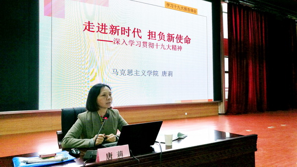 唐莉以“走进新时代 担负新使命”为主题,围绕党的十九大主题和主要成果、习近平新时代中国特色社会主义思想的重大贡献和丰富内涵、过去五年党和国家取得的历史性成就和历史性变革、中国特色社会主义进入新时代的重大政治判断、我国社会主要矛盾发生的新变化、新时代中国共产党的历史使命、新征程和新时代中国特色社会主义发展的战略部署等方面的内容,详细解读了党的十九大精神。