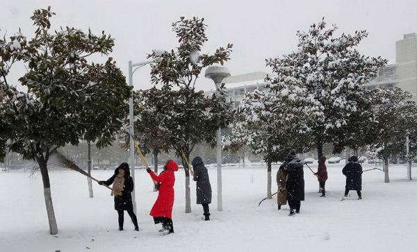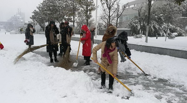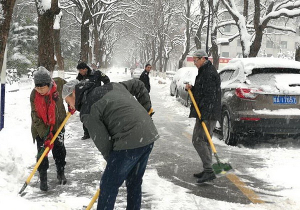 风雪中,师生们的头发、衣服和鞋子很快被雪水浸湿,但看到师生们出行更方便了,校园里的树木安全了,大家感到无比欣慰。