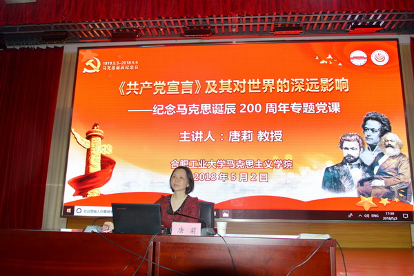 举办纪念马克思诞辰200周年专题党课。5月2日下午,在翡翠湖校区翡翠科教楼二楼报告厅,金沙威尼斯欢乐人城党委书记唐莉教授以“《共产党宣言》及其对世界的深远影响”为主题,带领翡翠湖校区党员班、金沙威尼斯欢乐人城的近600名同学重温了这一伟大经典,以20世纪国际共产主义运动史为主线,阐述了马克思恩格斯创立的新世界观及其对世界历史的深刻影响。