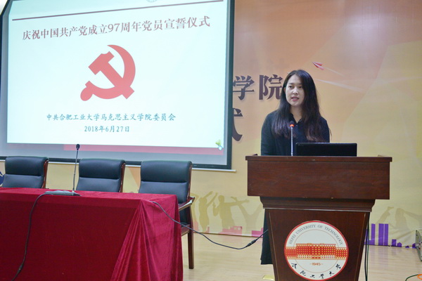 新党员代表、思政专业2015级本科生王晓迪发言,介绍了自己努力向党组织靠拢的心路历程,并代表全体新党员郑重承诺:将认真按照《党章》的标准严格要求自己,履行党员义务,在学习生活中自觉担负起光荣的责任和使命,为党的伟大事业贡献青春力量。