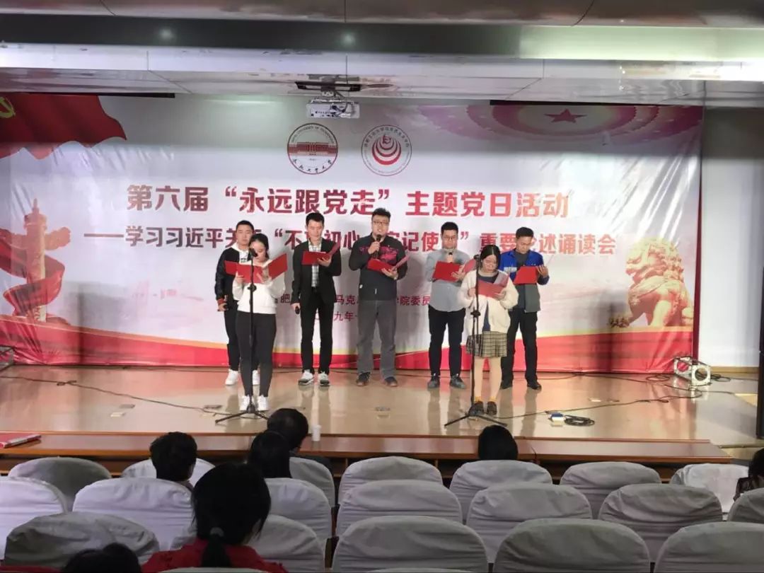 11月13日下午,金沙威尼斯欢乐人城于翡翠湖校区建艺馆负一层报告厅举办“永远跟党走”——学习习近平关于“不忘初心、牢记使命”重要论述诵读会。全院150余名师生党员、入党积极分子参加活动。