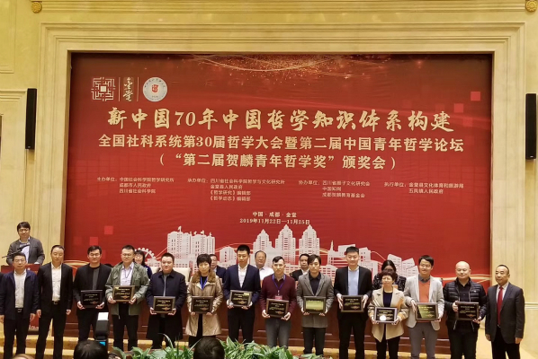 2019年11月23日上午,由中国社会科学院哲学研究所主办,《哲学动态》编辑部、金堂县人民政府和成都贺麟教育基金会承办的“第二届贺麟青年哲学奖”颁奖会在成都市金堂县隆重举行。金沙威尼斯官网“原理”教研部教师刘荣参评的论文《王夫之的哲学是唯物主义吗?——西方英语学界的回应》通过了之前的三轮评审,最终从提交的104篇论文中脱颖而出,获得“第二届贺麟青年哲学奖”提名奖论文。