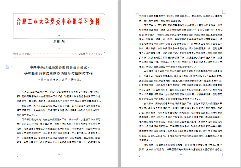 这次学习的主要内容是人民日报发布的:《习近平作出重要指示要求各级党组织和广大大党员干部团结带领广大人民群众坚决贯彻落实党中央决定部署紧紧依靠人民群众坚决打赢疫情防控阻击战》(1月28日)、《关于加强党的领导、为打赢疫情防控阻击战提供坚强政治保证的通知》(1月29)、《中共中央政治局常务委员会召开会议研究加强新型冠状病毒感染的肺炎疫情防控工作中共中央总书记习近平主持会议》(2月4日)、《习近平主持召开中央全面依法治国委员会第三次会议强调全面提高依法防控依法治理能力为疫情防控提供有力法治保障》(2月6日)等多篇文章。