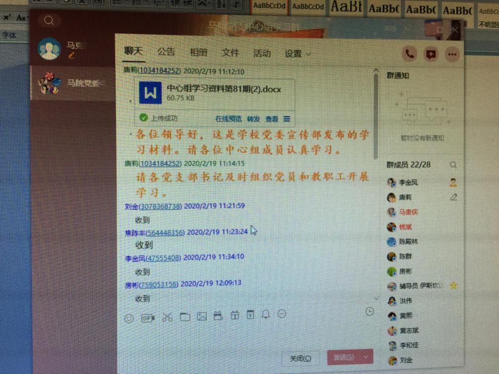 2月18日,金沙威尼斯欢乐人城党委建立了QQ群,学院班子成员、党委委员、教研部主任、教工党支部书记、研究所所长等共28人进群。当天,学院党委举办线上党委理论中心组学习会议。在群里转发了校党委宣传部发布的《中心组学习资料81期》。学院党委书记唐莉要求每个理论中心组成员认真学习,把线上学习和线下自学统一起来,各党支部做好党员和教职工的理论学习的组织和督查工作。