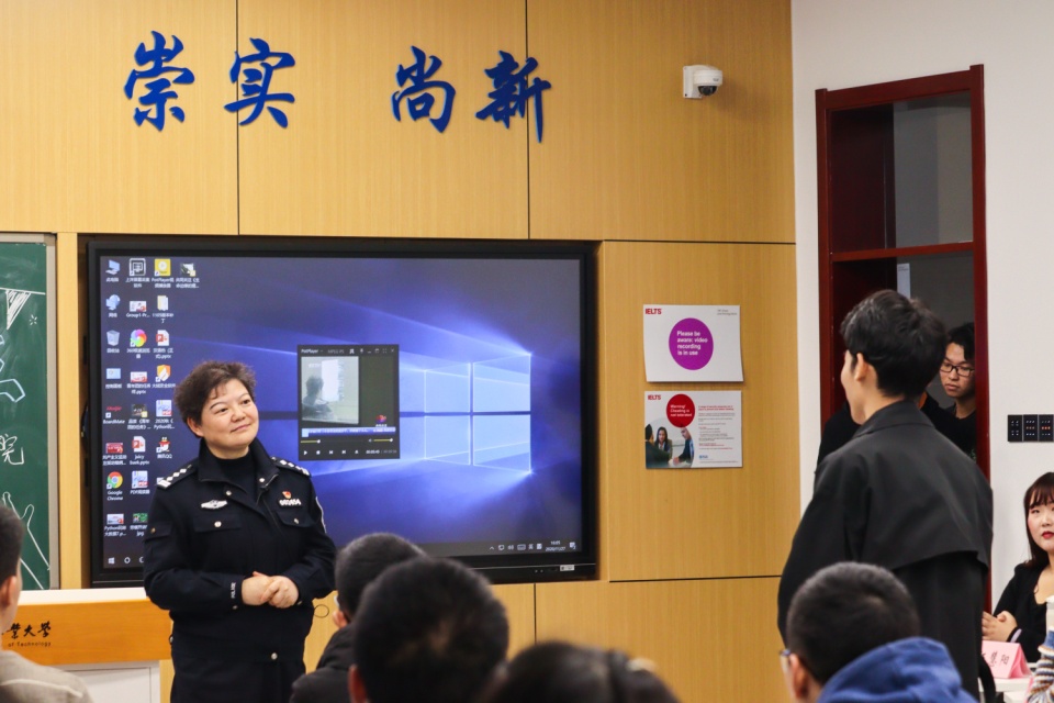 葛杨警官首先开讲。她从一次“生命边缘的握手”讲起,分享了自己在千钧一发的关键时刻惊心动魄的谈判故事,她以对话互动的方式和幽默生动的语言引导同学们“珍惜生命,在任何时候没有过不去的坎”“贵在坚持,有一颗恒心,不轻易放弃”“积极帮助别人,才能快乐自己”“立足本职,做好当下的事”。现场气氛热烈,不时爆发出笑声和掌声。