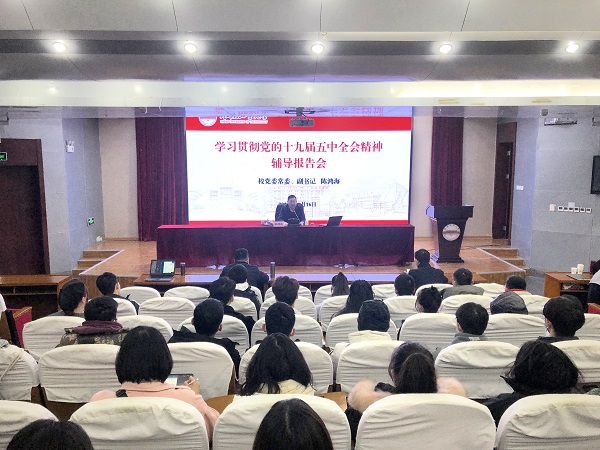 12月16日下午,校党委副书记陈鸿海在翡翠湖校区建艺馆负一楼报告厅作党的十九届五中全会精神宣讲报告,来自金沙威尼斯欢乐人城、汽车与交通工程学院的负责老师和学生代表参会,会议由金沙威尼斯欢乐人城党委书记尉德芳主持。