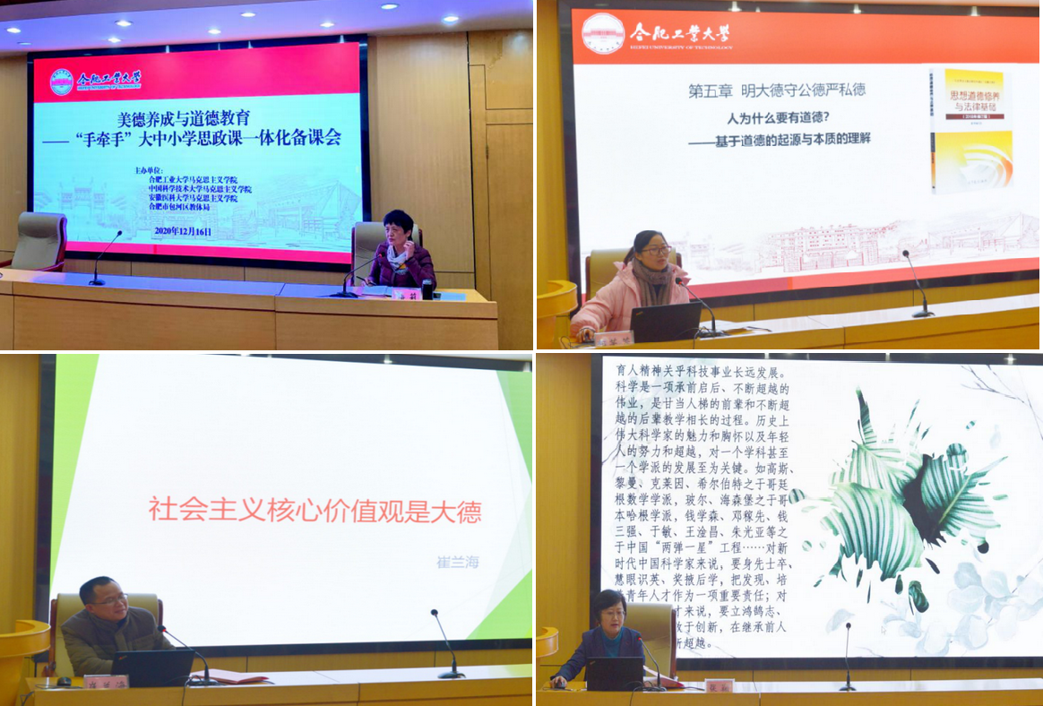 12月16日,由金沙威尼斯欢乐人城、中国科学技术大学、安徽医科大学三所高校的金沙威尼斯欢乐人城,以及合肥市包河区教体局共同主办的“美德养成与道德教育——‘手牵手’大中小学思政课一体化备课会”在金沙威尼斯欢乐人城学术会议中心二楼报告厅举行。来自三所高校、包河区教体局和部分中小学的负责人与思政课教师,全国高校研究生思政理论课分教指委委员、金沙威尼斯欢乐人城黄志斌教授,以及金沙威尼斯欢乐人城思想政治教育专业的本科生和研究生共60余人参加了会议。