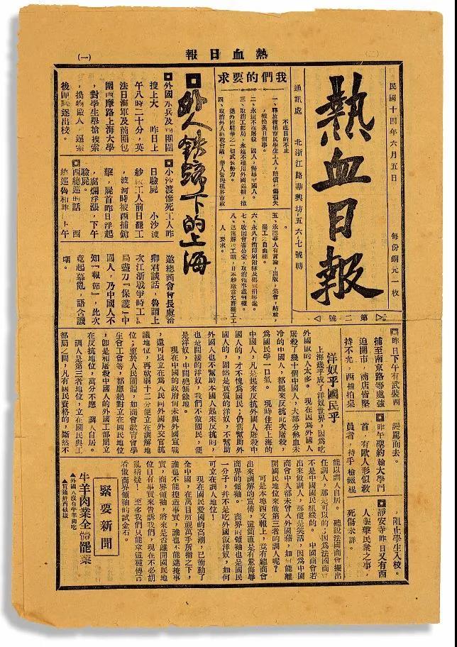 1925年6月4日,《热血日报》创刊,这是中国共产党历史上的第一份日报。它诞生于五卅运动的高潮中,由瞿秋白主编,每天出版8开4版一张,成为党宣传、组织、推动这一伟大的反帝爱国斗争的舆论先锋、中国被压迫民众的喉舌。《热血日报》只出了24期,当年6月底被租界巡捕房查封而停刊。它与五卅运动一起,在党的历史上留下了光辉一页。