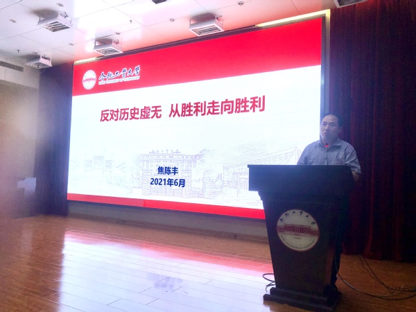 焦陈丰以《反对历史虚无从胜利走向胜利》为主题进行宣讲。他从“芦林一号”的故事谈起,向同学们讲解了故事背后所掩藏的历史虚无主义的危害,他指出,“历史虚无”只强调碎片化的历史事件,割裂了历史和逻辑的统一,否定历史的客观逻辑和规律。随后通过“毛主席73个补丁的睡衣”和“朱德总司令存款全部上交充当党费”两个小故事进一步向同学们讲述了有关老一辈无产阶级革命家的艰苦朴素精神。他提醒同学们要以苏联亡党亡国为鉴,并以“上甘岭战役一个苹果的故事”再现共产党人抗战时的艰辛和团结,呼吁同学们自觉抵制历史虚无主义。