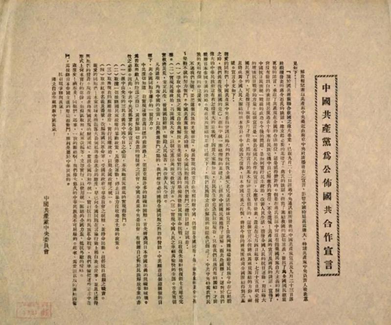 1937年9月22日,国民党中央通讯社发表延搁两个多月的《中共中央为公布国共合作宣言》。23日,蒋介石发表谈话,实际上承认了中国共产党的合法地位。中共的《宣言》和蒋介石谈话的发表,宣告国共两党第二次合作的实现,标志着以国共合作为主体的抗日民族统一战线正式形成。