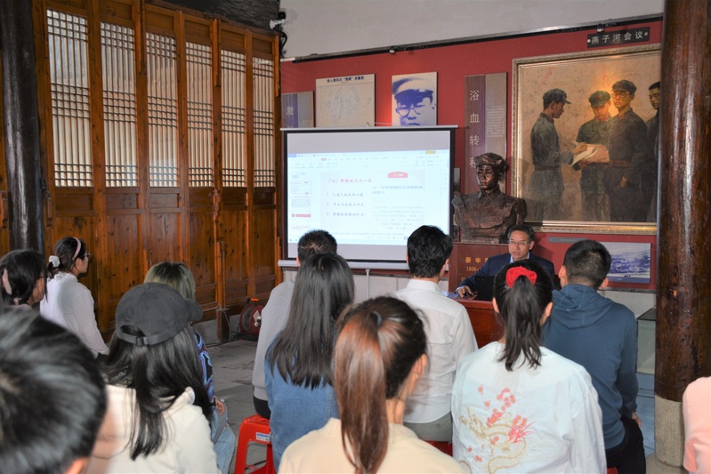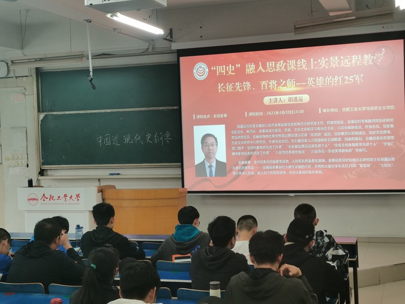 为更好地落实2021年度金沙威尼斯欢乐人城书记开局项目“‘四史’融入思政课教学改革创优行动”,卓有成效地把“四史”融入“中国近现代史纲要”教学,金沙威尼斯官网中国近现代史纲要教研部于4月20日下午组织开展“四史”融入思政课线上实景远程教学活动,邀请安徽省金寨县委党史和地方志研究室主任、档案馆馆长胡遵远同志,在金寨县鄂豫皖红军纪念园内的红25军军政机构旧址,面向全校本科生进行题为《长征先锋、百将之师——英雄的红25军》的实景教学。院长牛小侠教授和李庆宇、刘金、余琛老师一起,带领部分本科生代表到金寨现场学习,校党委宣传部副部长周慧、党委宣传部网络宣传管理科科长卫婷婷一起参加。“纲要”教研部全体教师组织校内当时在上“中国近现代史纲要”课的1000余名本科生在合肥校区的教室以线上远程的方式实时参与实景教学。
