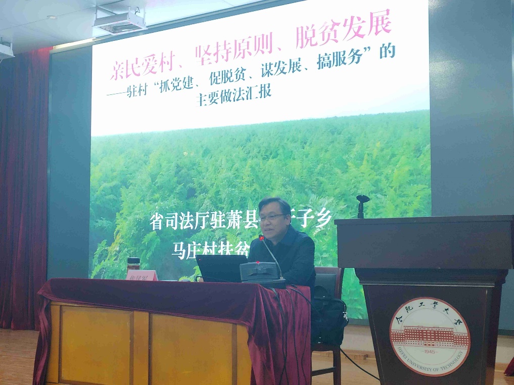 面对同学们热切的目光,焦凤军同志用质朴的话语讲述了担任宿州市萧县孙圩子乡马庄村第一书记、驻村扶贫工作队队长四年多的奋斗历程。从刚入村的杨絮飘飘、家家闭门拒绝,到用真诚敲开村民大门,被艾滋病贫困户当作亲人;从村民对工作队的不屑,到后来凡事都要请工作队做见证人。焦凤军同志的一句话“你不把村民当亲人,村民就不把你当第一书记”引发了同学们的深思,一名普通的共产党员心中老百姓的事就是天大的事,这一点深深打动了同学们, 党的好干部在同学心目中竖起了党的伟岸形象,同学们真真切切感受到了党一心为民的温度。