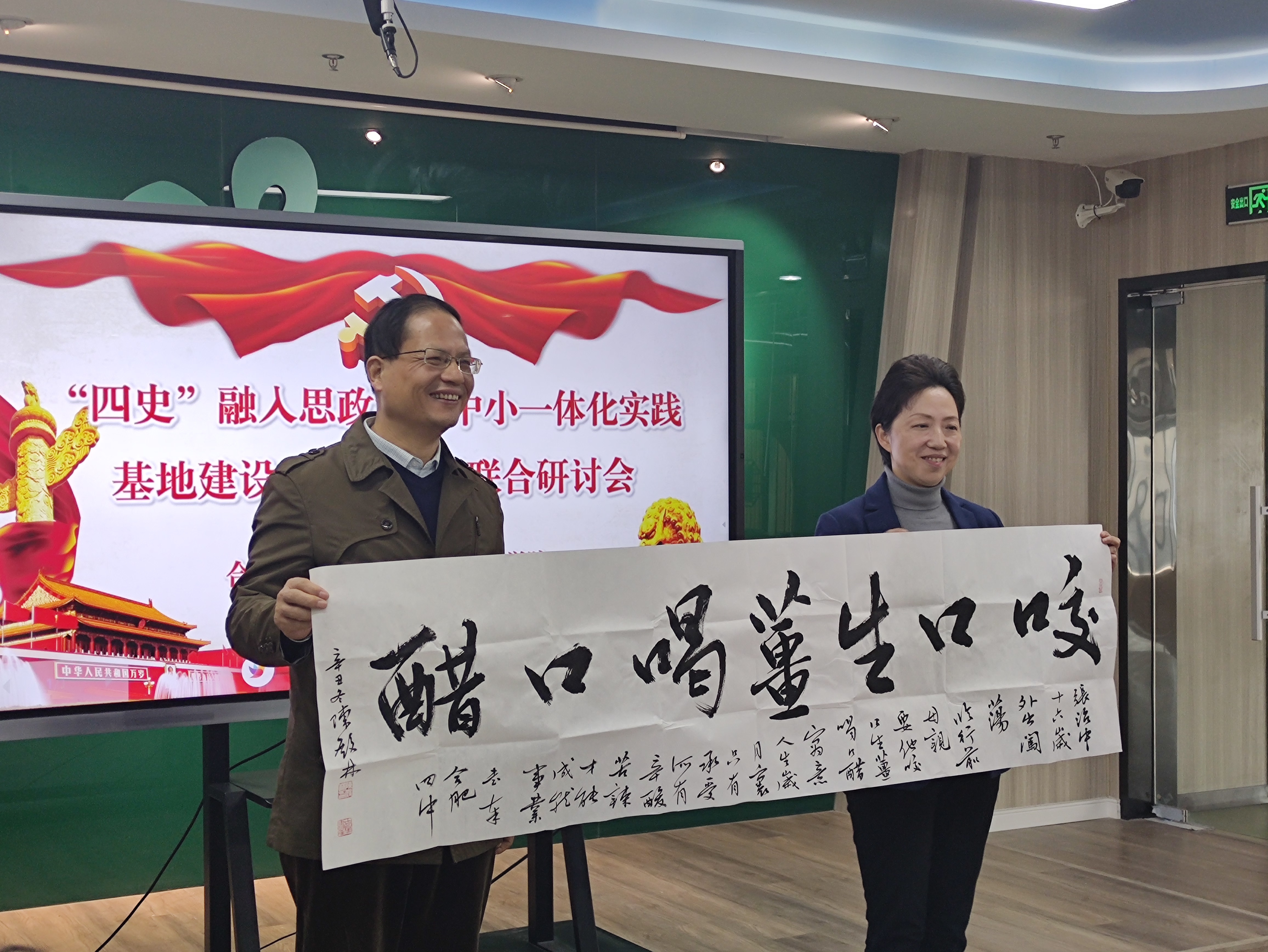 开幕式上,合肥四中校长吴英明首先致辞,她着重介绍了该校历史沿革与思政课建设情况,表示希望通过此次签约,藉由“大手拉中手、名校带新校”,帮助四中师生进一步学好“四史”、守好初心,做好思政教育,实现共建共赢。潘莉副院长介绍了金沙威尼斯欢乐人城的基本情况、创建“四史”融入思政课大中小一体化实践基地项目的背景及“纲要”教研部在推动“四史”融入思政课教学方面形成的特色,表示期待通过与合肥四中的签约,促进双方在思政课教学上的交流,取长补短,共同进步。随后,双方举行了签约和授牌仪式,陈殿林教授向四中赠送了由自己创作的书法作品。