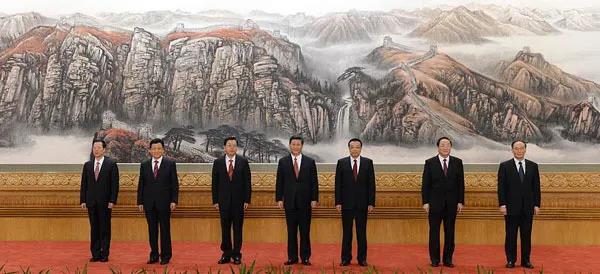 2012年11月15日,在中共十八届一中全会上当选的中共中央总书记习近平和中央政治局常委李克强、张德江、俞正声、刘云山、王岐山、张高丽在北京人民大会堂同采访十八大的中外记者亲切见面。