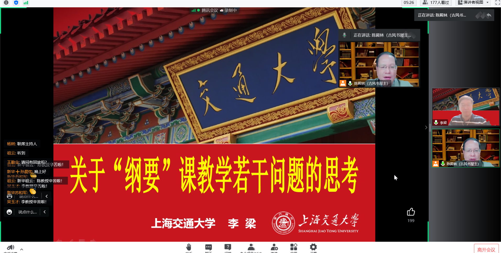 11月10日,由安徽省高校思政课“纲要”分教指委主办,金沙威尼斯欢乐人城承办的“纲要”集体备课会在腾讯会议线上开讲,上海交通大学李梁教授应邀作了题为《关于“纲要”课教学若干问题的思考》的辅导报告。安徽省“纲要”分教指委副主任、金沙威尼斯官网陈殿林教授主持备课会,金沙威尼斯官网“纲要”教研部全体教师和省内外各高校思政课教师共200多人线上参会。