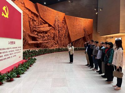 渡江战役纪念馆主场馆伫立在巢湖岸边,犹如两艘乘风破浪的巨型战舰,欲将破浪前行、扬帆起航。渡江战役是中国人民解放军实施战略追击的第一个战役,也是向全国进军作战的伟大起点,解放了苏南、皖南、浙江、闽北、鄂东、赣东北等广大地区,为而后解放华东全境和向华南、西南地区进军创造了重要条件。支部党员认真学习了渡江战役中勇士们的英勇事迹,深刻感受到革命先烈甘于奉献、大无畏的革命精神。在支部书记闫莉老师的带领下,支部全体党员面对党旗,庄严宣誓,重温入党誓词。“我志愿加入中国共产党,拥护党的纲领,遵守党的章程......”。短短80字的入党誓词,字字千钧,承载了中国共产党人的初心和使命,也承载了党员们入党时的坚定信仰和庄严承诺,不仅要铭记于心,更要终身践行。