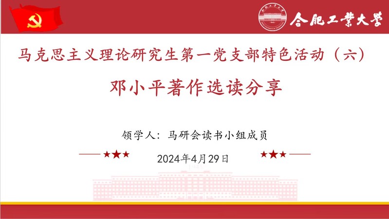2024年4月29日19时,马克思主义理论专业研究生第一党支部与马研会《邓小平文选》“共同富裕”专题读书小组共同开展2023-2024学年党支部特色活动。本次特色活动以读书分享形式开展,特别邀请了马研会《邓小平文选》“共同富裕”专题读书小组全体成员,小组成员殷轶豪、钱泰来两位同学作主题交流与分享。