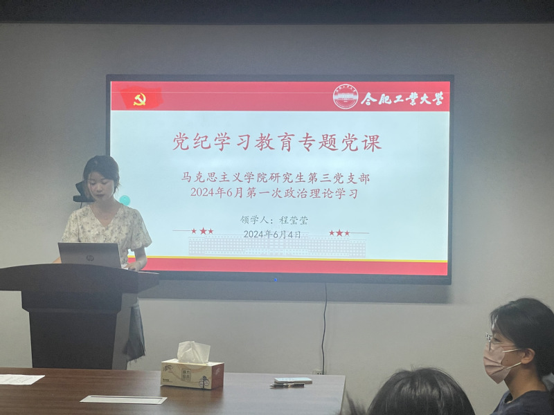 会议伊始,马理论研究生第三党支部书记程莹莹从四个方面指出了《条例》修订的重要意义,她认为,广大党员要深入学习领会《条例》修订的主旨要义,始终坚持严的基调,不断完善纪律规矩。其次,她带领全体党员深入解读了《条例》常见的十二个问答,从多个方面指出党员违反党纪都会承担相应的后果,警示全体党员要以身作则,将铁的纪律真正转化为党员的日常习惯和自觉遵循。最后,她要求全体党员明确目标要求,把遵规守纪刻印在心,内化为言行准则,始终做到忠诚干净担当。同时也要抓住这次学习的重点,做到学深学透学到位,将党纪学习教育融入日常、抓在经常,切实推动党纪学习教育走深走实。