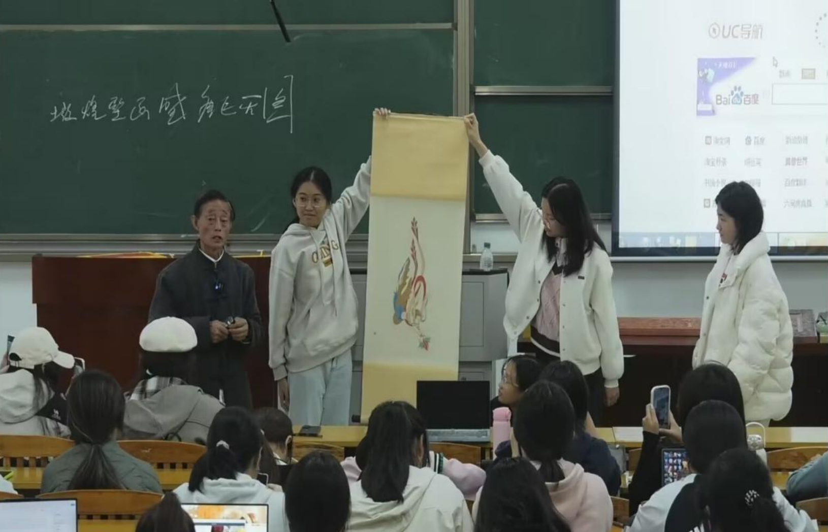 李江民大师报告的主题是“人类非物质文化遗产——中国雕版印刷技艺”。李江民大师首先介绍了自己的成长经历和工作经历;接着结合中国雕版印刷技艺的历史发展,着重对唐宋元明清时期的经典作品进行了展示介绍,包括《金刚经》《敦煌壁画·盛唐飞天图》《四美图》《西厢记·窥简图》《群仙贺寿图》《清代云南提督学院岁试喜报》《文武状元》《鲤鱼跃龙门》等雕版印刷作品,还展示介绍了其本人创作的《江都水利枢纽》《千里运河扬州卷》《金龙献瑞》等代表作品;接着介绍了雕版印刷写、刻、印、装的工艺流程,并现场与同学们共同印制《四美图》《西厢记·窥简图》,还把提前准备的《一团和气图》以及现场印制的作品赠送给同学们。最后,李江民大师希望同学们刻苦学习,提高动手能力,自己动手做一些校园文创产品,努力推动中华优秀传统文化的传承和弘扬。